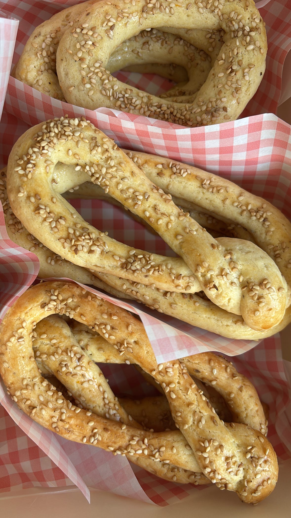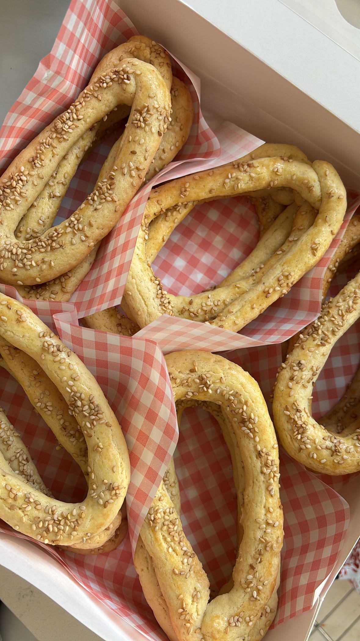 I recalled standing in front of a bakery in Athens and staring though glass at a display of large circular cookies, all lined up in a row. They had a soft sheen and were bedazzled with sesame seeds. I wish I had eaten one, but of course - I let the moment pass by.
